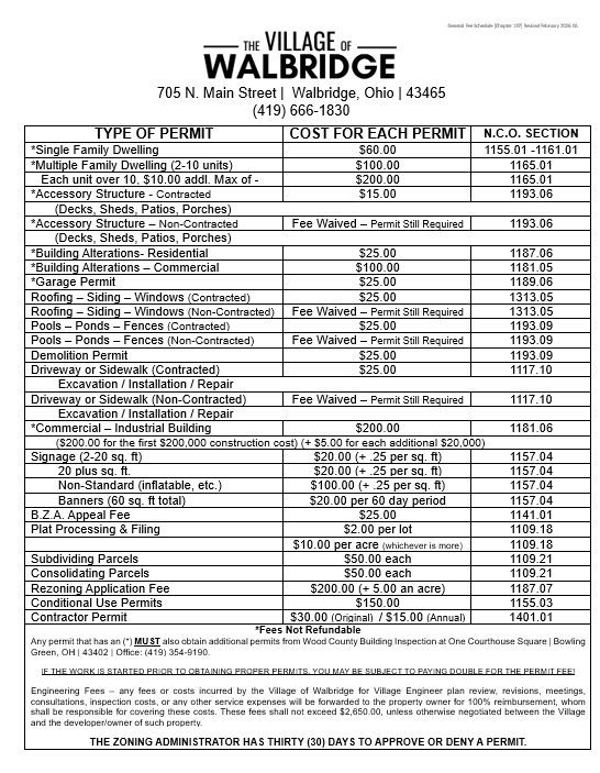 Planning and Zoning is a function of the Administrative team. The Village Administrator also acts as the Zoning Inspector and oversees all of the planning and zoning related matters that occur within the Village of Walbridge. This includes issuing Zoning Permits, enforcing zoning code, and providing additional assistance to the Planning Commission and Committee of Zoning Appeals.